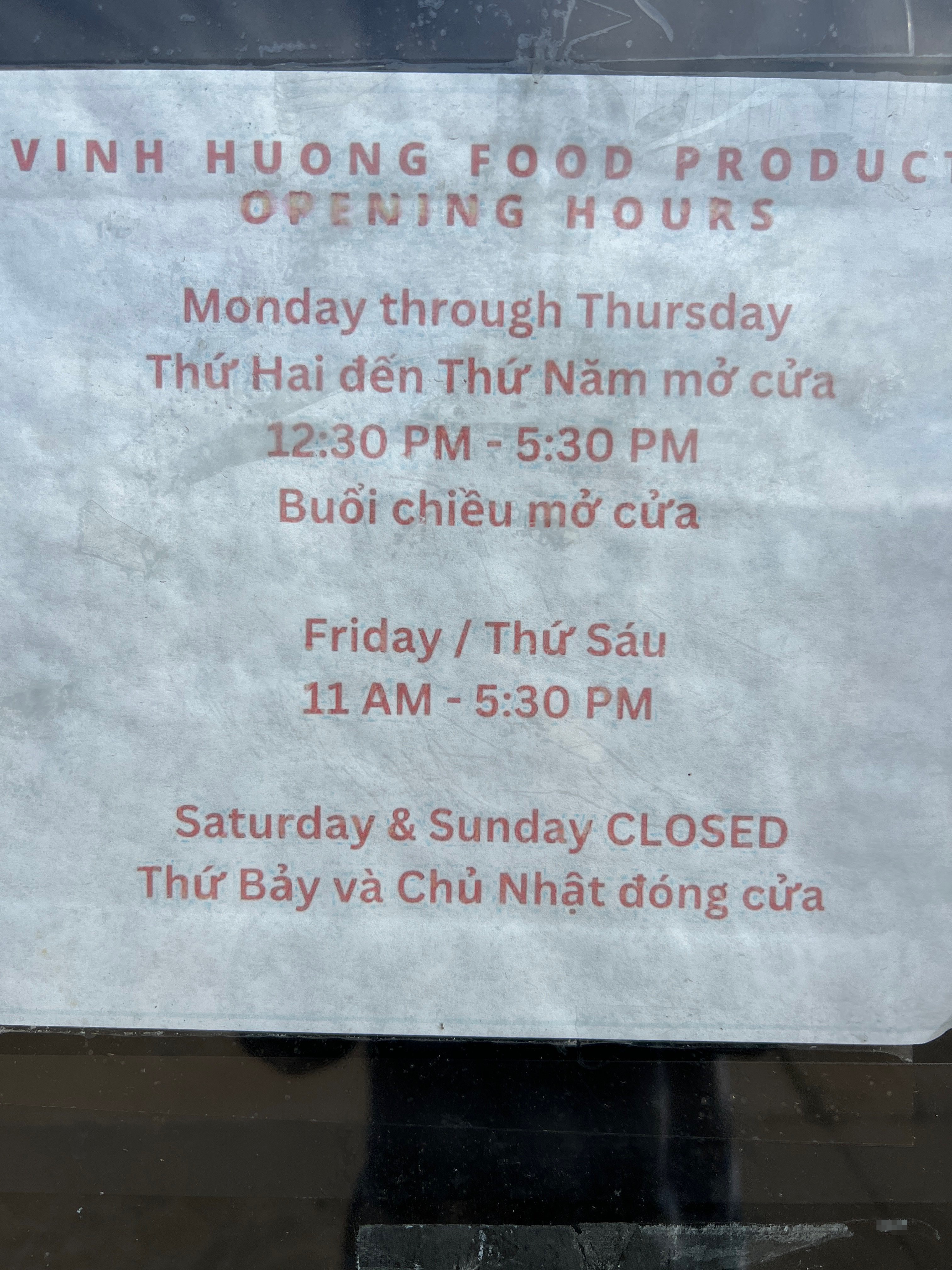 Vinh Huong Food Products offers amenities such as Accepts Contactless Payments, ensuring a comfortable and convenient experience for clients.